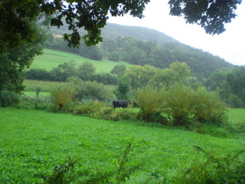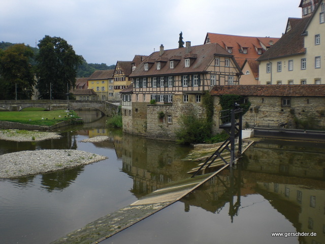 Der Weg aus Aalen heraus ist etwas verwirrend, aber kein wirkliches Problem. Bei Wasseralfingen kommen wir schließlich auf den ab hier beispielhaft gut ausgeschilderten Kocher-Jagst-Radweg. Zunächst noch entlang einer vielbefahrenen Straße führt uns der Weg nach wenigen Kilometern weg vom städtischen Trubel zum Kocher. Davor gerate ich noch, vollkommen unschuldig, in eine prekäre Situation. Vor mir fährt eine Frau mit Pedelec, schon aufgrund ihrer beträchtlichen Leibesfülle beansprucht sie gut die Hälfte des Radweges. Mangels Klingel mache ich durch ein lautstarkes "Vorsicht" auf mich aufmerksam. Das hört die Dame dann auch, schwenkt ein wenig nach rechts und dann, als ich auf gleicher Höhe mit ihr bin, unvermittelt wieder nach links, also auf mich zu. "Sie sollten schon rechts fahren", kläre ich sie über die allgemeingültigen Verhaltensregeln im Verkehr auf und fahre weiter. Die Allerbeste kommt nach und lässt ausrichten, ich möge mir doch eine Klingel anschaffen. Das werde ich bei der nächsten Gelegenheit machen. Der zunehmende Radverkehr, an sich ja eine tolle Sache, lässt keine andere Wahl. Rufen, Pfeifen oder ähnliches ist wirkungslos. Eine Klingel muss her. Der Kocher, hier im Unterlauf noch eher ein Bach, schlängelt sich durch die Ostalb. Die schöne Landschaft und ein Radwanderweg, der nun wirklich vom Feinsten ist, machen Spass und heben die Stimmung. In Abtsgmünd entdecken wir eine Bäckerei mit Straßenkaffee. Eine Butterbrezel, dazu Kaffee, soviel Zeit muss sein. Auch auf die Gefahr hin, von der rechtslinksklingelfordernden Frau und ihrem Begleiter eingeholt zu werden und damit möglicherweise ein erneutes kritisches Überholmanöver zu riskieren. Aber der Weg ist nun ja breit genug, um selbst am enorm ausladenden Hinterteil der Klingelfordernden gefahrlos vorbei fahren zu können.Ich habe Glück! Sie steht und studiert Hinweisschilder. Schnell vorbei und nichts wie weg! Wir fahren mit leicht erhöhtem Tempo in Richtung Sulzbach a. Kocher. Der Radweg ist immer noch richtig klasse, auch die Beschilderung bleibt vorbildlich. Ein guter Tipp für so manchen Radwegeplaner: Fahr mal hin und sieh: So geht das also auch! Erst vor Schwäbisch Hall tauchen die ersten Steigungen auf, aber keine davon verdirbt den Genuss der Fahrt.