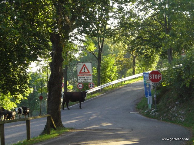 Die Auffahrt zum Monte Tomba beginnt. Kein Verkehr mehr, auf der schmalen, Kurvenreichen Straße wird das Radfahren gleich wieder zum Vergnügen. Auch wenn es nun wieder ordentlich steil ist. Unterhalb des Monte Tomba sind mehrere große Grillplätze angelegt. An den Wochenenden ist hier sicher einiges los. Heute, es ist Dienstag, sind wir völlig alleine unterwegs. Nur wenige Fahrzeuge kommen uns entgegen. Nach den Grillplätzen wird es richtig steil, mit einer Steigung von mehr als sechzehn Prozent zieht die Straße kerzengerade nach oben. Kein schöner Anblick! Umso schöner zeigt sich der Blick nach Süden in die Poebene. Ein großes Weidegebiet tut sich auf, die Steigung geht auf erträgliche Werte zurück und wir erreichen auf weit über 800 Meter Höhe die Almwirtschaft "Malga Doc". Kurze Pause, wir gönnen uns ein gut gekühltes Franziskaner-Weissbier! Drei ausgebüchste Esel belagern den Platz vor der Malga Doc, werden dann aber bald von ihrem Eigner auf die Weide zurück getrieben.