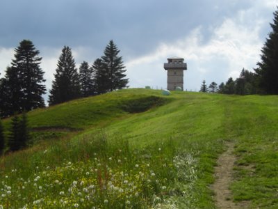 "Gipfelbestimmungsgerät"(Bild oben rechts). Mir fällt kein passenderer Name für das Teil ein. Eine gute Gelegenheit für eine erste kleine Pause. Ein Brunnen oder eine Quelle täte jetzt gut, ich bin komplett durchgeschwitzt.
